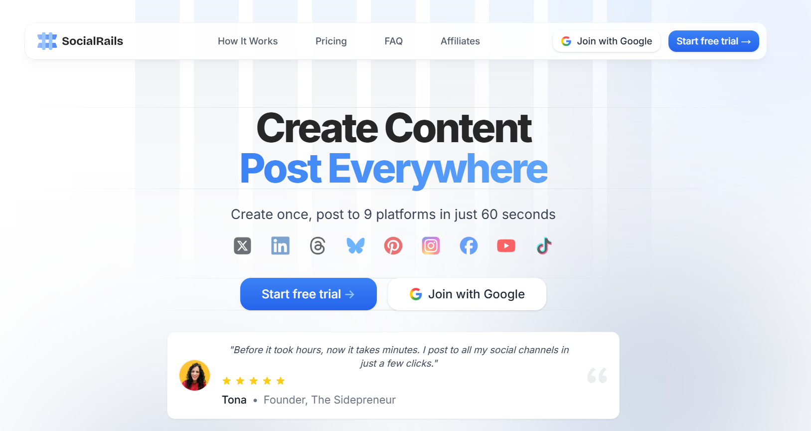 | SocialRails | 3-day free trial | Post Scheduling, AI Content Generation, Built-in Image Editor, Multi-Workspace Support. | $29/month |