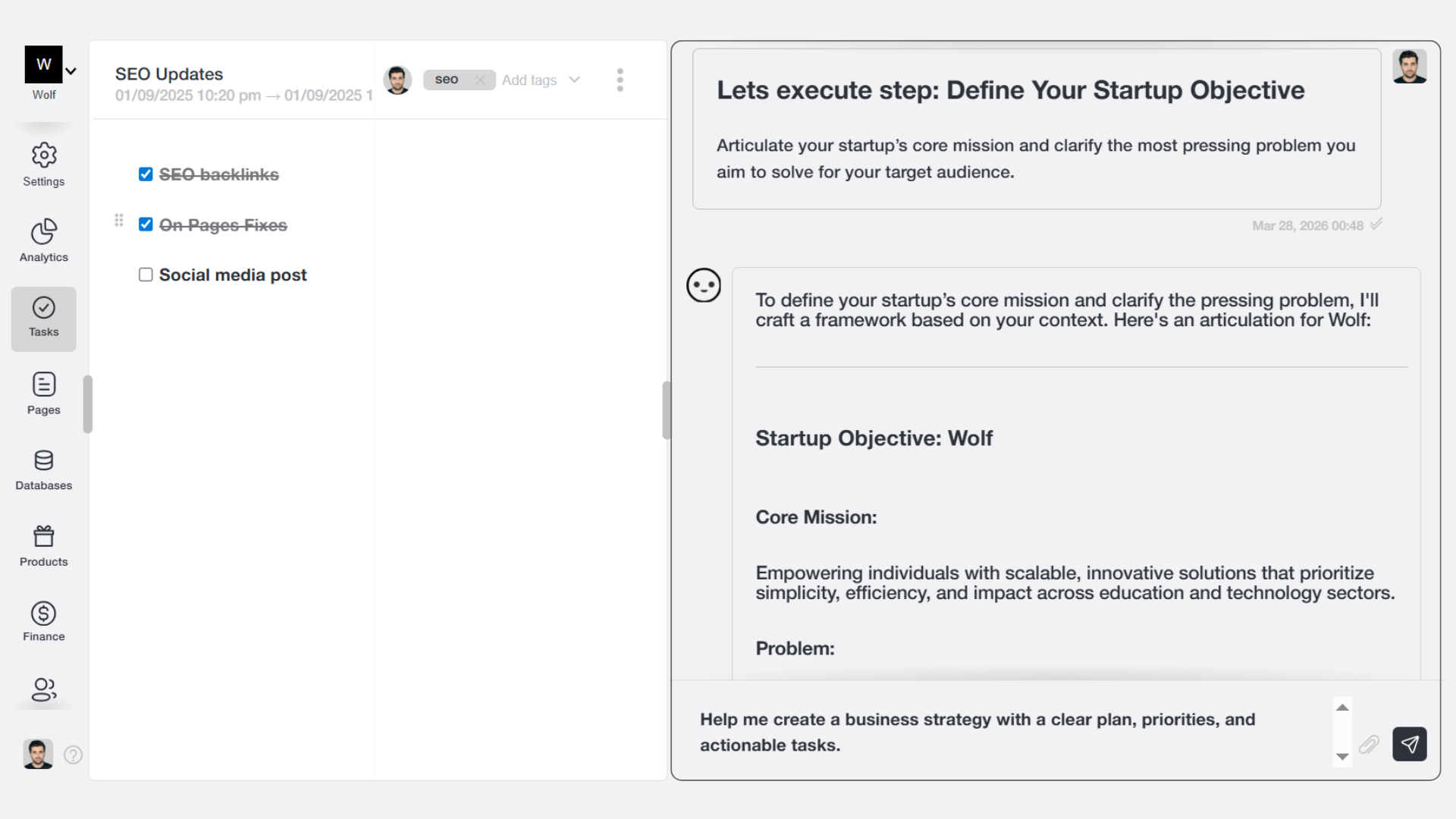 Our AI assistant can help turn your ideas into clear strategies, structured plans, and actionable tasks. You can ask it to break goals into steps, organize work by priority, and set up tasks directly inside your Venturz workspace. This helps you move from planning to execution faster, reduces confusion, and keeps your team focused on what matters most.