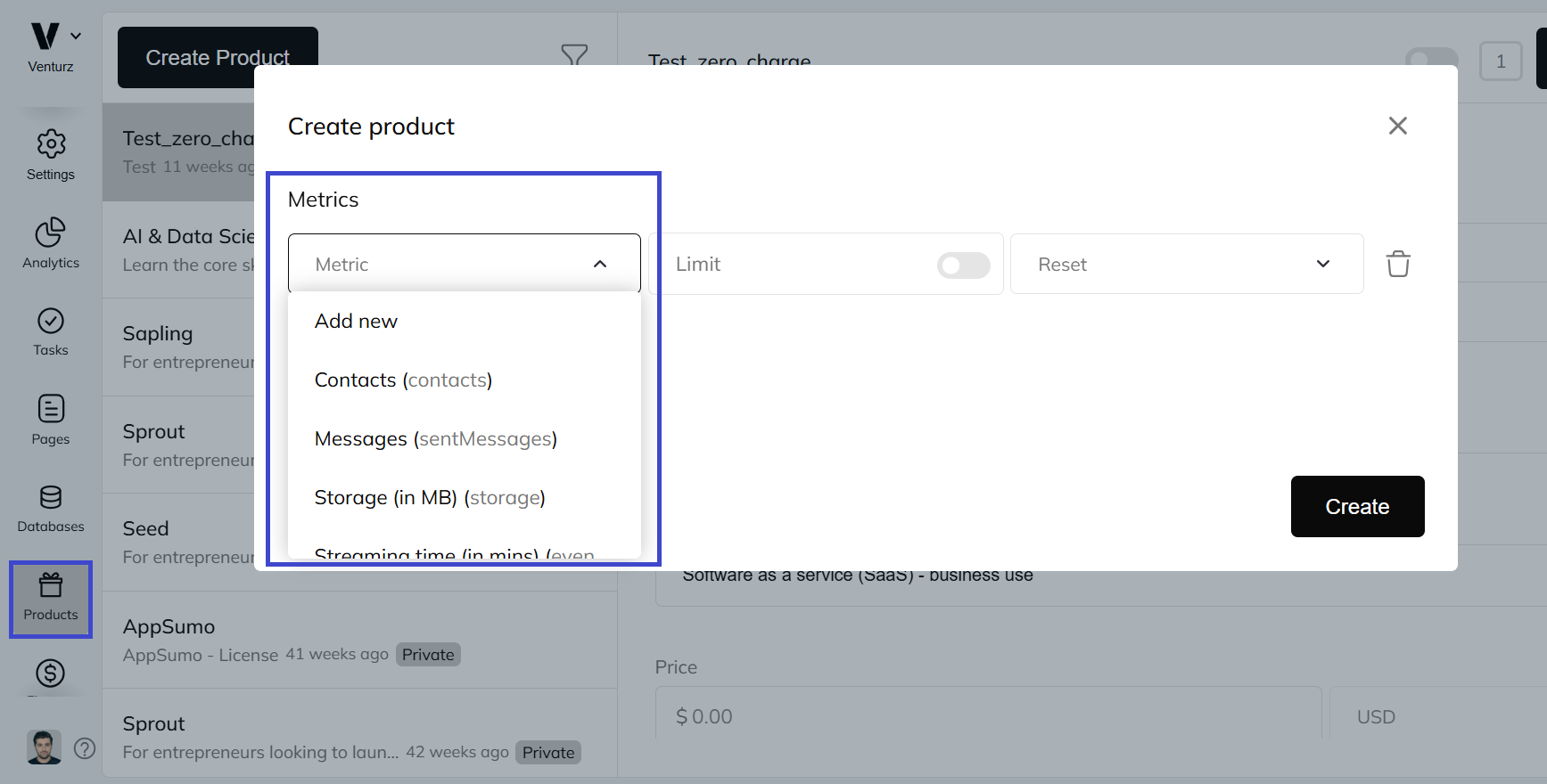 The Products feature in Venturz helps you create and manage pricing plans for your services, digital tools, SaaS platforms, or any subscription-based offering. Whether you're selling access to an AI tool, course, membership, or app—this feature lets you manage billing, plans, usage limits, and more.