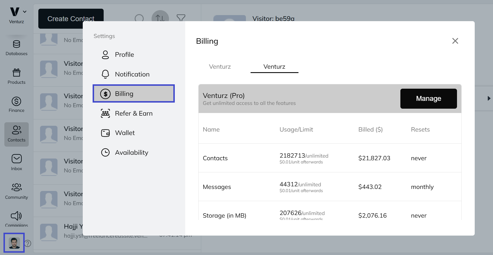 You’ll also be able to see how much you’ll be charged if you exceed your plan’s limit. Currently, Venturz charges $0.01 per unit for additional usage beyond your included quota.