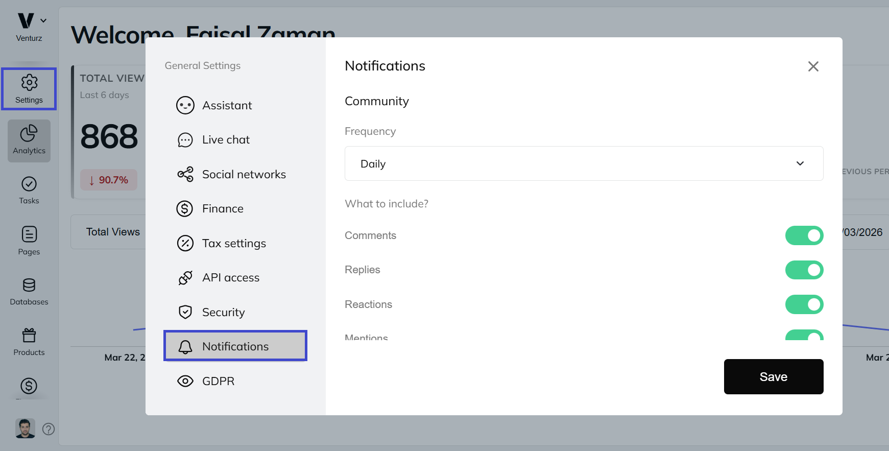 Venturz gives you full control over how and when you get notified about important updates from your Community and Inbox. You can decide what you want to be notified about and how often you want to receive those updates.